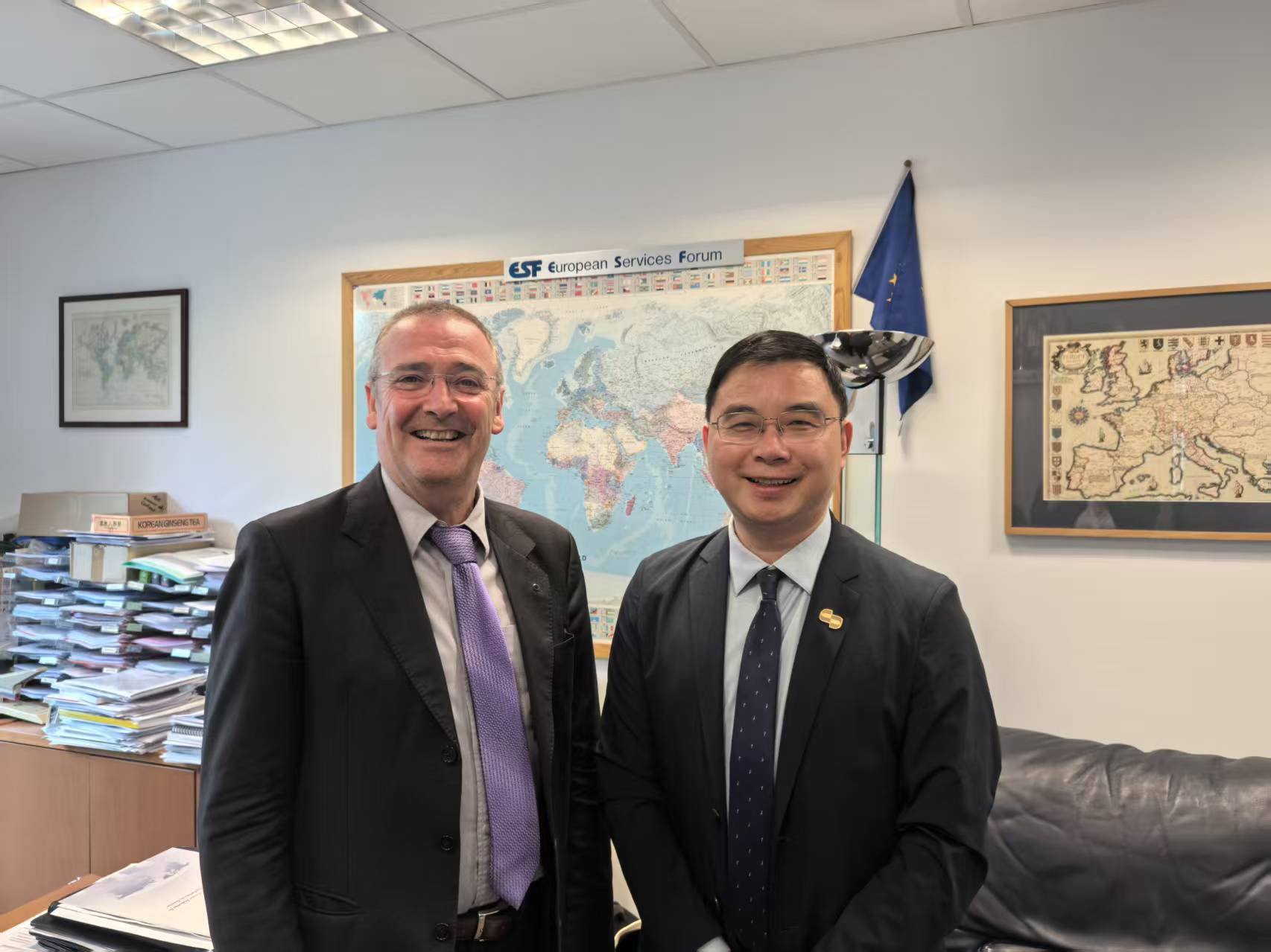 当地时间2025年9月30日上午,中国贸促会商业行业委员会(以下简称“商业贸促会”)秘书长姚歆在比利时布鲁塞尔会见欧洲服务业论坛(European Services Forum, ESF)总干事 Pascal Kerneis。