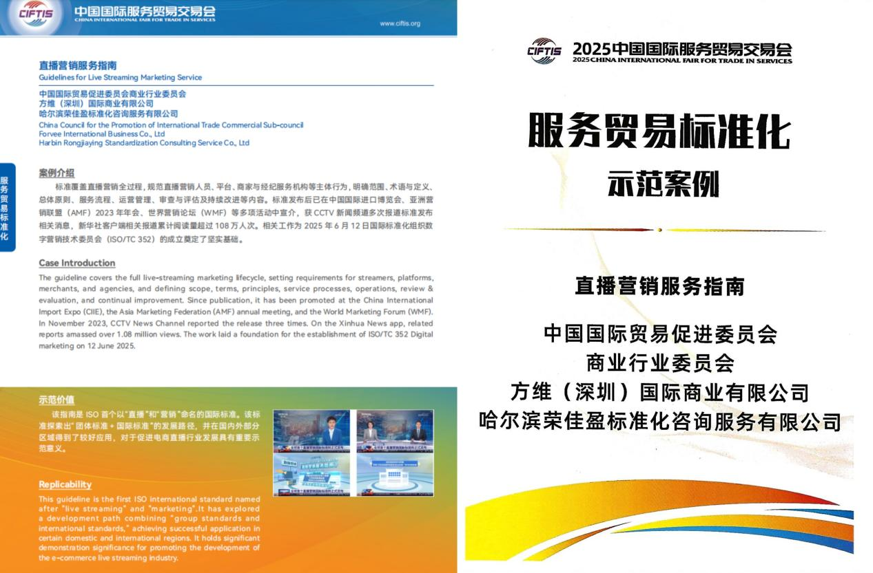 中国贸促会商业行业委员会主导的ISO/IWA 41:2023《直播营销服务指南》国际标准成功入选2025年服贸会《服务贸易标准化示范案例》的“服务贸易标准化”板块,成为该板块发布的6个案例之一。该案例的入选将成为推动服务贸易创新发展、深化国际服务贸易交流合作的有力载体。《服务贸易标准化示范案例》于9月12日的“服务示范案例交流活动”期间,由中国国际经济技术交流中心和北京市国际服务贸易事务中心联合发布。