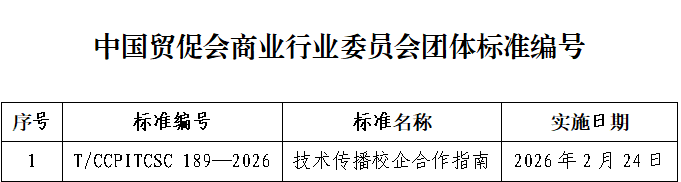 根据《中国国际贸易促进委员会商业行业委员会团体标准管理办法》(商贸促字〔2016〕64号)和《中国贸促会商业行业委员会关于下达2024年第七批团体标准项目计划的通知》(商贸促字〔2024〕199号),中国贸促会商业行业委员会已组织有关方面完成《技术传播校企合作指南》团体标准(标准编号为T/CCPITCSC 189—2026)的制定工作,并批准正式发布,现予公告。