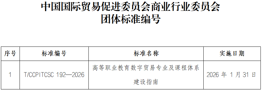 根据《中国国际贸易促进委员会商业行业委员会团体标准管理办法》(商贸促字〔2016〕64号)和《中国贸促会商业行业委员会关于下达2023年第二批团体标准项目计划的通知》(商贸促字〔2023〕113号),中国国际贸易促进委员会商业行业委员会已组织有关方面完成《高等职业教育数字贸易专业及课程体系建设指南》团体标准的制定工作,并批准正式发布。现予公告。